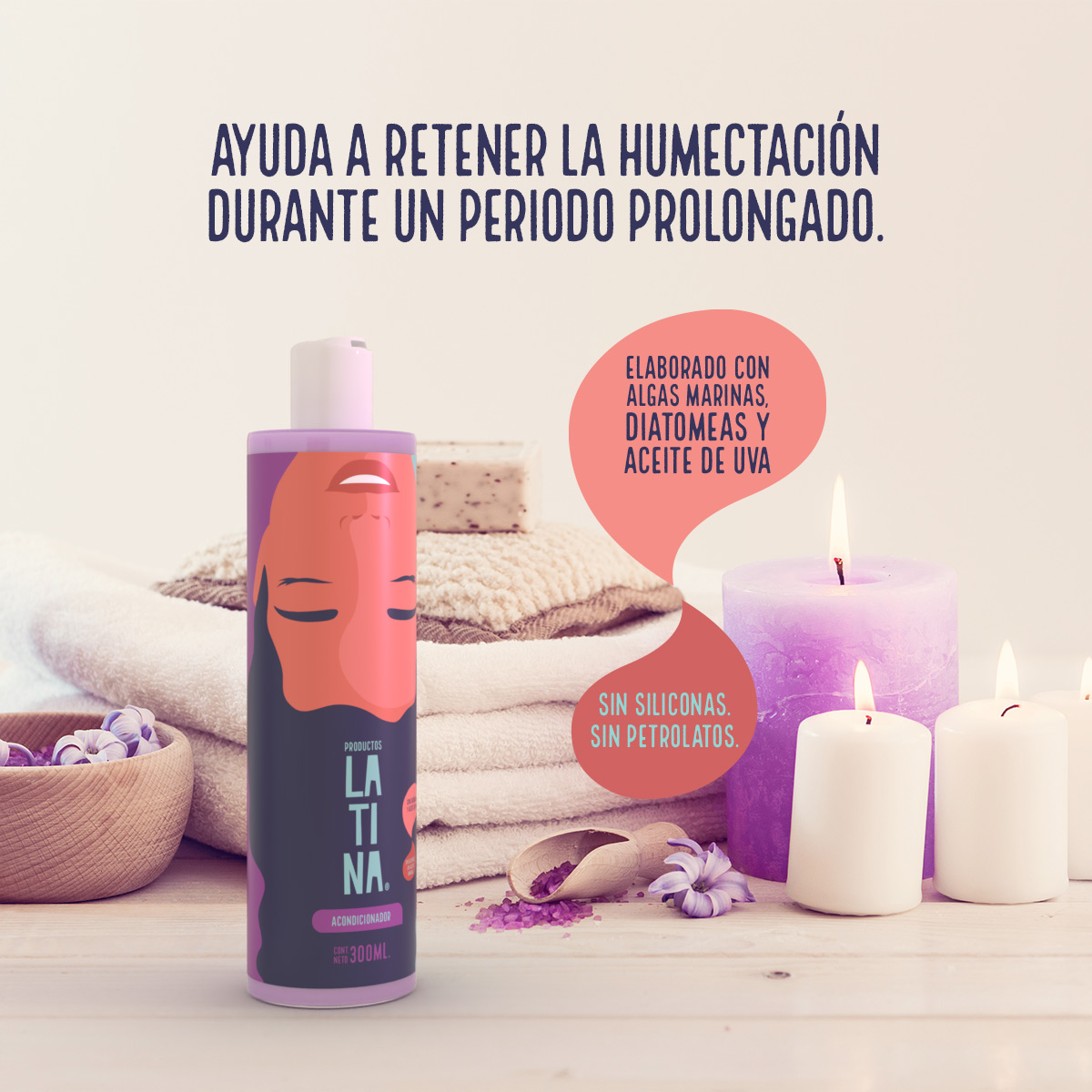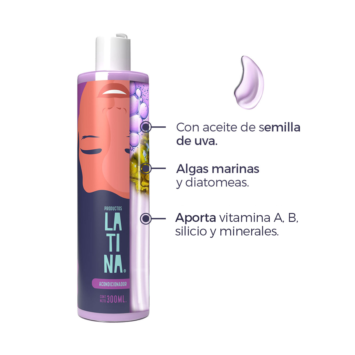 Acondicionador: Elaborado con algas marinas y aceite de uva. Enriquecido con lecitina de soya, sorbitol y diatomeas.