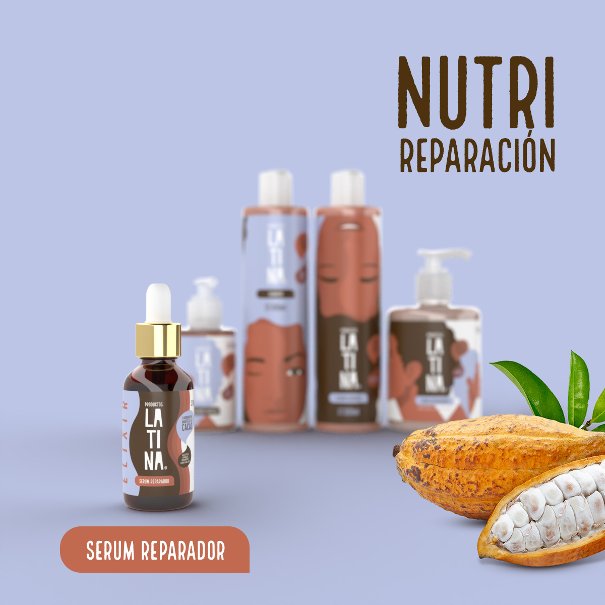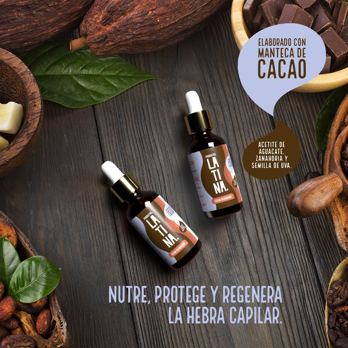 Serum Reparador, elaborado con manteca de cacao, Nutre da brillo y repara puntas dañadas.